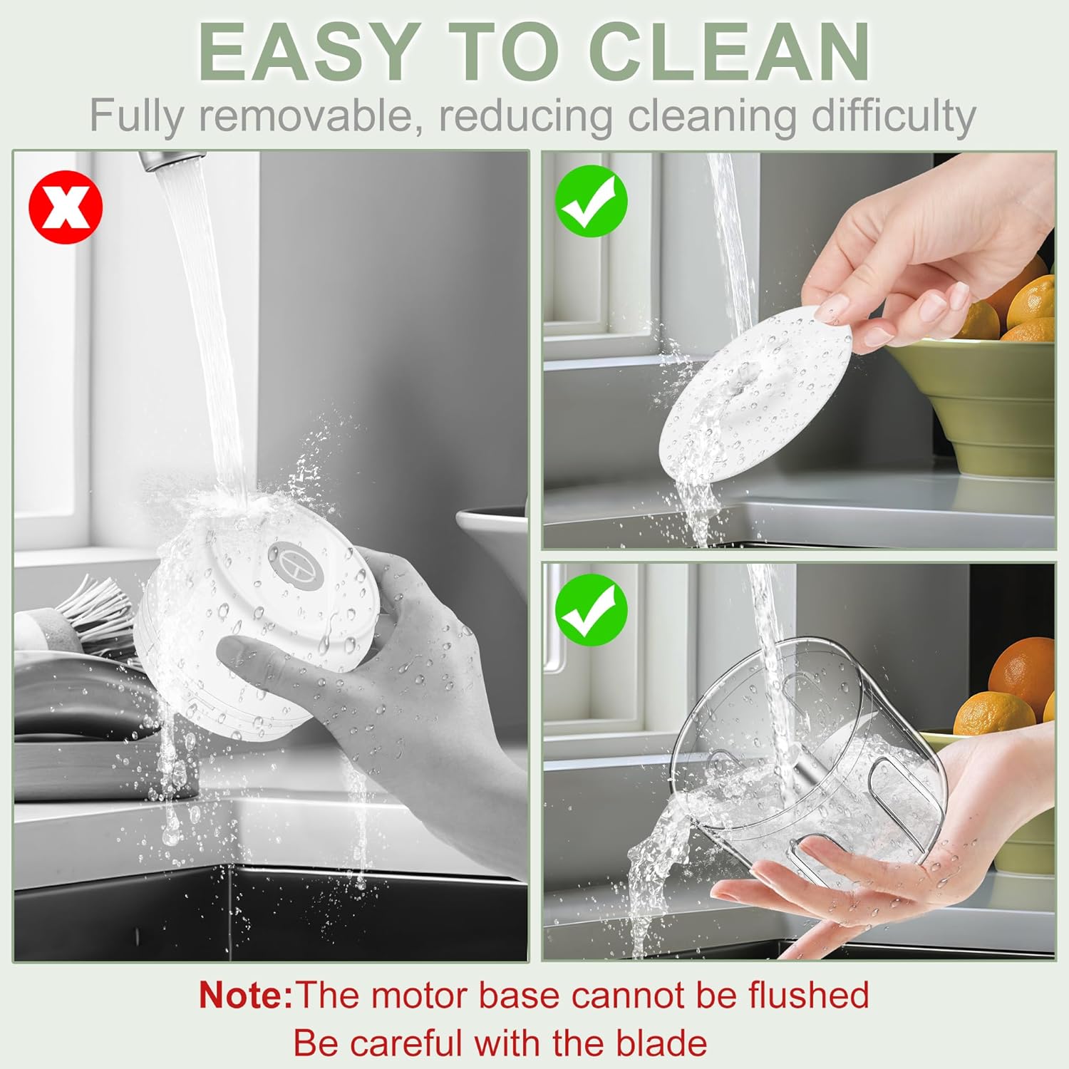 Easy to Clean: The cup and blades of the electric garlic chopper are detachable for quick and easy rinsing. The splash-proof design prevents food from getting on the motor during operation, ensuring a cleaner finish.