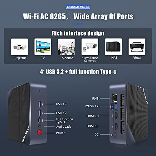 【Small But Powerful Desktop Pc】BOSGAME Mini PC measures only 4.9x 4.4x 1.6 inches. Pure copper heat pipe, higher efficiency of the mini pc cooling. Built-in silent control chip, heat dissipation without noise. Multiple interface designs (2*HDMI Port, 1*Type-C, 1 x DC Port, 1* RJ45, 4*USB 3.2 Ports, 1 x Audio-in/out Jack) easily meet office business needs, home audio-visual needs