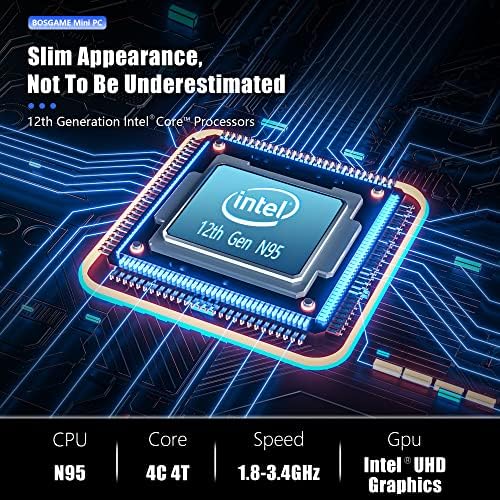 BOSGAME Mini PC Intel 12th N95 4C/4T (up to 3.40Ghz), 8GB DDR4+256GB M.2 NVMe SSD PCIe 4, Mini Desktop Computer Windows 11 Pro Mini Computers,Support 4K Triple Display/BT 4.2/WiFi AC 8265/4*USB 3.2
