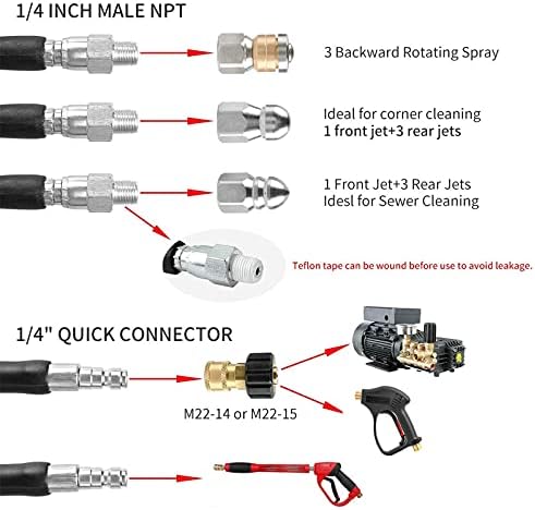 ★【Excellent Design】The sewer cleaning kit includes three different types of nozzles: the button nozzle has one front nozzle at 0° to remove blockages, and three rear nozzles at 33° to wash away loose debris from the front nozzle. The rotating nozzle rotates the three rear nozzles at 33° for shot peening, sprays water into the blocked pipe, rinses and removes debris. Corner sewer jetter nozzle water sideways to clear blockages at the corner, and six rear nozzles for more powerful cleaning.