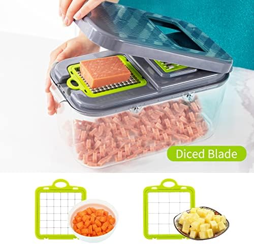 2pcs large & small shredded blades slicers (eg. carrot slicer) 2pcs large & small sliced blades slicers (eg. cucumber slicer) 1pc minced garlic blades slicer (eg. garlic slicer) 1pc flower knife blades slicer (eg. potato slicer) 3pcs large & medium & small diced blade dicers (eg. onion chopper) 2pcs large & small cutting blade dicers (eg. egg cutter) 2pcs large & small dense mesh dicers (eg. food chopper) 1 Set food drain basket & drain board, outer storage box 1pc hand guard 1pc peeler 1pc egg separator 2pcs cleaning brush