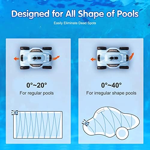【Long Runtime & Fast Charge】Only takes 3.5 hours to fully charge and provides over 110 minutes of cleaning capabilities, the automatic pool vacuum easily cleans up to 1,076 sq. ft. of above/in-ground pools to a depth of 6.56 ft. (2 m) (max slope for pools < 15°); Suitable for all linings and shapes (round, rectangular, or oval)