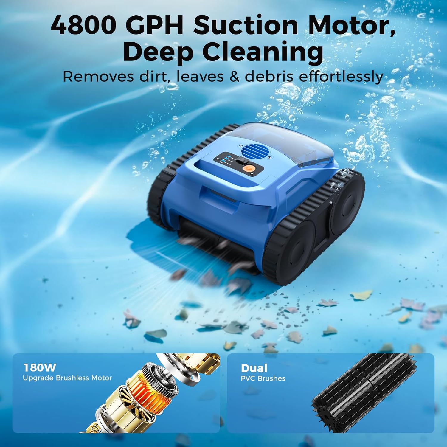 4800GPH Powerful Suction – Are you still worried about the garbage in the pool? Use our upgraded 180W brushless motor pool vacuum robot for professional level cleaning, providing suction up to 4800GPH. Pool robot equipped with dual PVC brushes, it can capture fine sediments (leaves, sand, small stones, and floating debris) ranging from large to small up to 300 μ m, leaving your swimming pool floor, walls, and water lines spotless.