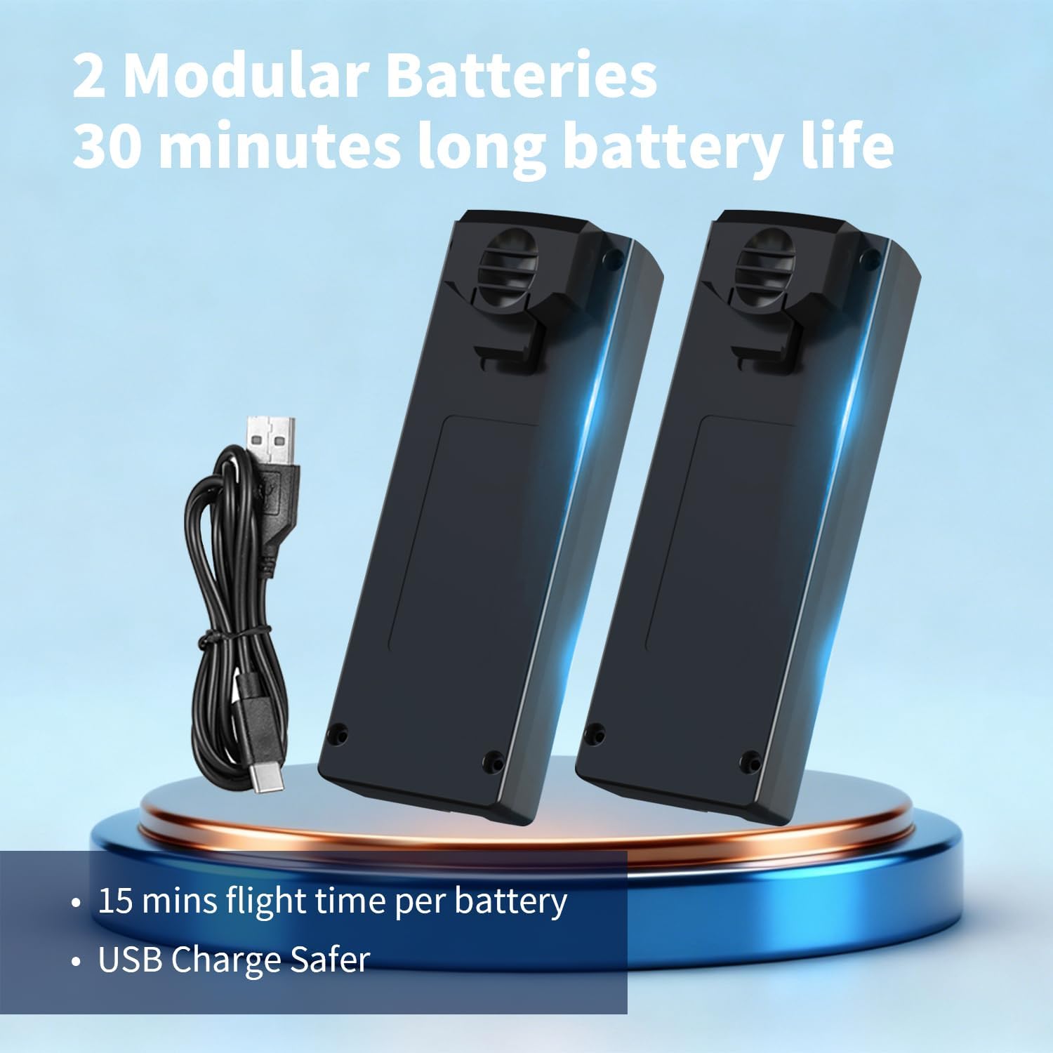 【2 Batteries & Extended Flight Time】This camera drone comes with 2 upgraded batteries, each delivering up to 15 minutes of stable flight. By alternating batteries, you can enjoy a total flight time of up to 30 minutes, longer than most entry-level remote control drones. Note: Frequent 3D flips and high-speed maneuvers may reduce single-battery flight time, which is normal for performance drones for adults in the same class.