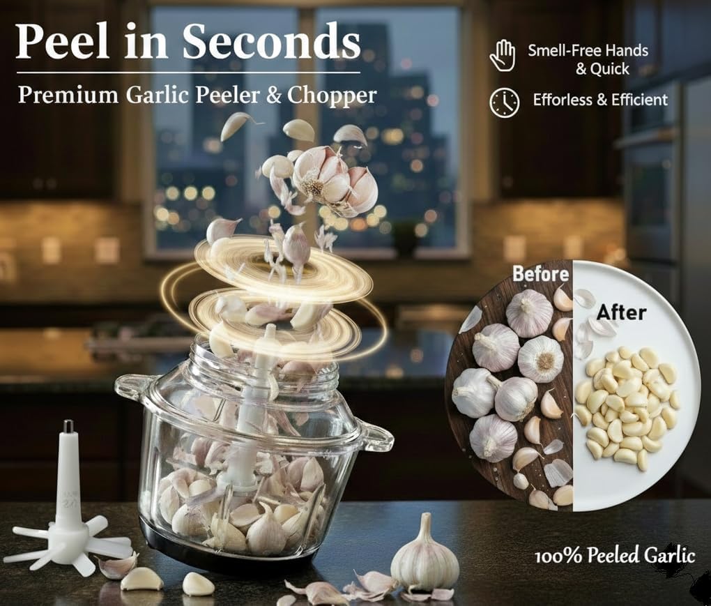 Electric Garlic Peeler & Chopper: The Stonvea BPA-Free Garlic Peeler is a powerful multi-function food processor designed for fast, effortless meal prep. With an 8-cup (2L) glass bowl and dual blades, it easily peels garlic, chops vegetables, grinds meat, processes nuts, frozen fruit, onions, and more-most tasks finished in about 10 seconds