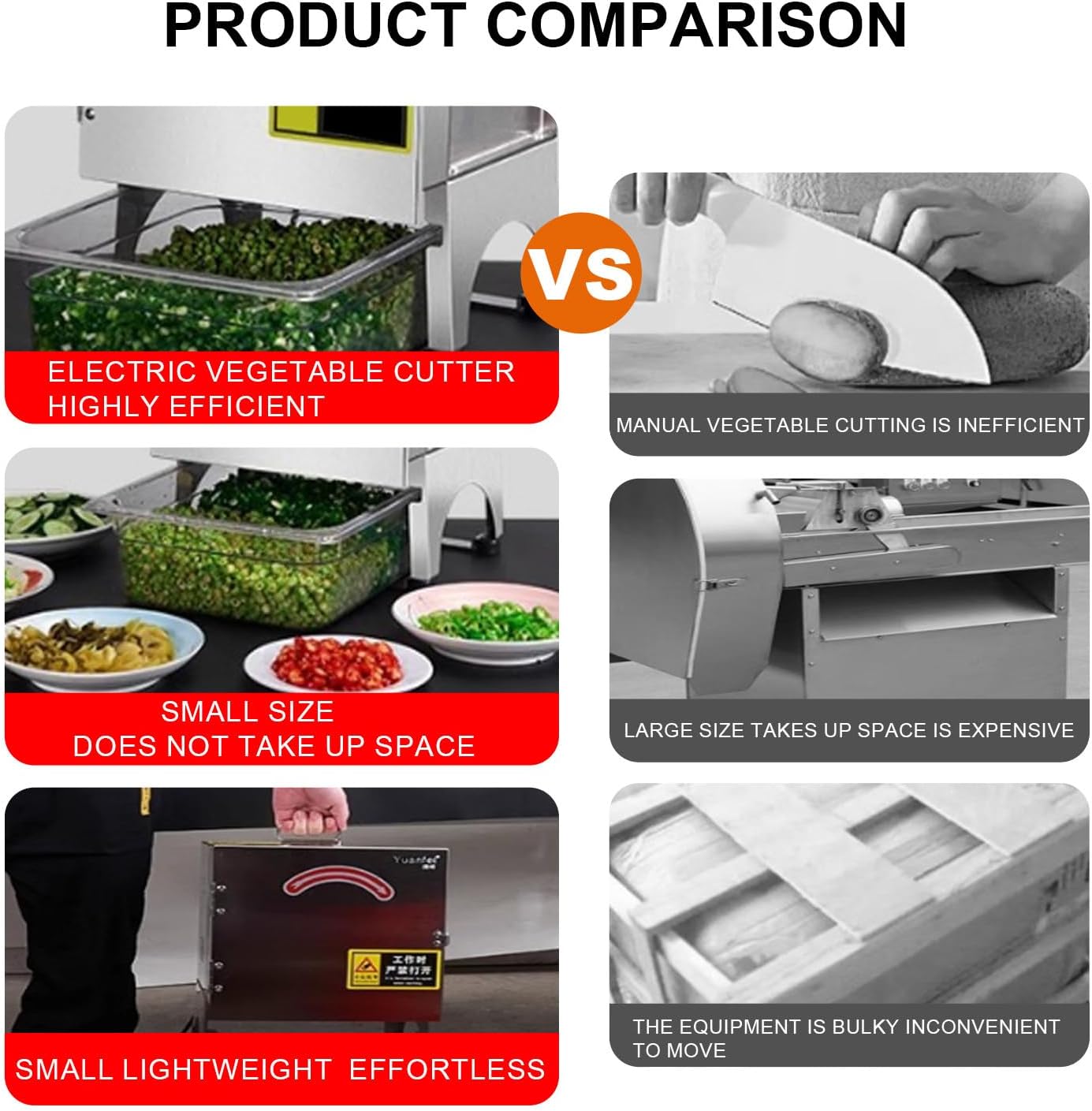 VEGETABLE: This commercial electric vegetable is constructed from durable, rust-resistant, and corrosion-resistant 304 stainless steel, with a sleek, easy-to-clean and maintain appearance. Equipped with a thick, wear-resistant, food-grade, non-slip conveyor belt, it minimizes vegetable remnant from sticking, ensuring food safety and hygiene.