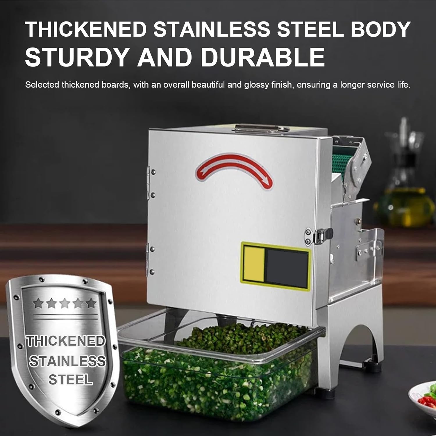COMMERCIAL SCALLION CHIVE CHILI LEEK CHOPPER: This commercial vegetable cutter is suitable for slicing, shredding, dicing and chopping various stem and leaf vegetables, such as sauerkraut, FLEXIBLE ADJUSTMENT: This commercial vegetable features independent speed adjustments for the conveyor belt and blade, allowing for flexible adjustment of thickness from 1.5 to 35 mm. This allows for precise control of cutting length and thickness to meet diverse processing requirements.