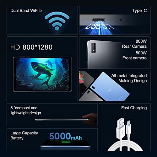 FILY Android Tablet, 8 inch Tablet Android12, 4GB+128GB Storage, Quad-Core Processor, 2.0Ghz, Full Metal Cover, Bluetooth5.0, 5+8MPCamera, 5G/2.4G Dual-Band WiFi HD Touchscreen Tablets (Blue)