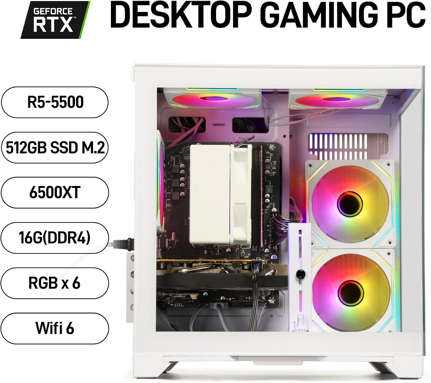 Gaming PC Desktop Computer – Ryzen 5 5500, Radeon RX 6500XT 4GB, 16GB DDR4 RAM, 512GB NVME SSD, Prebuilt Tower for 1080P Gaming, Streaming, School & Home Office (White)