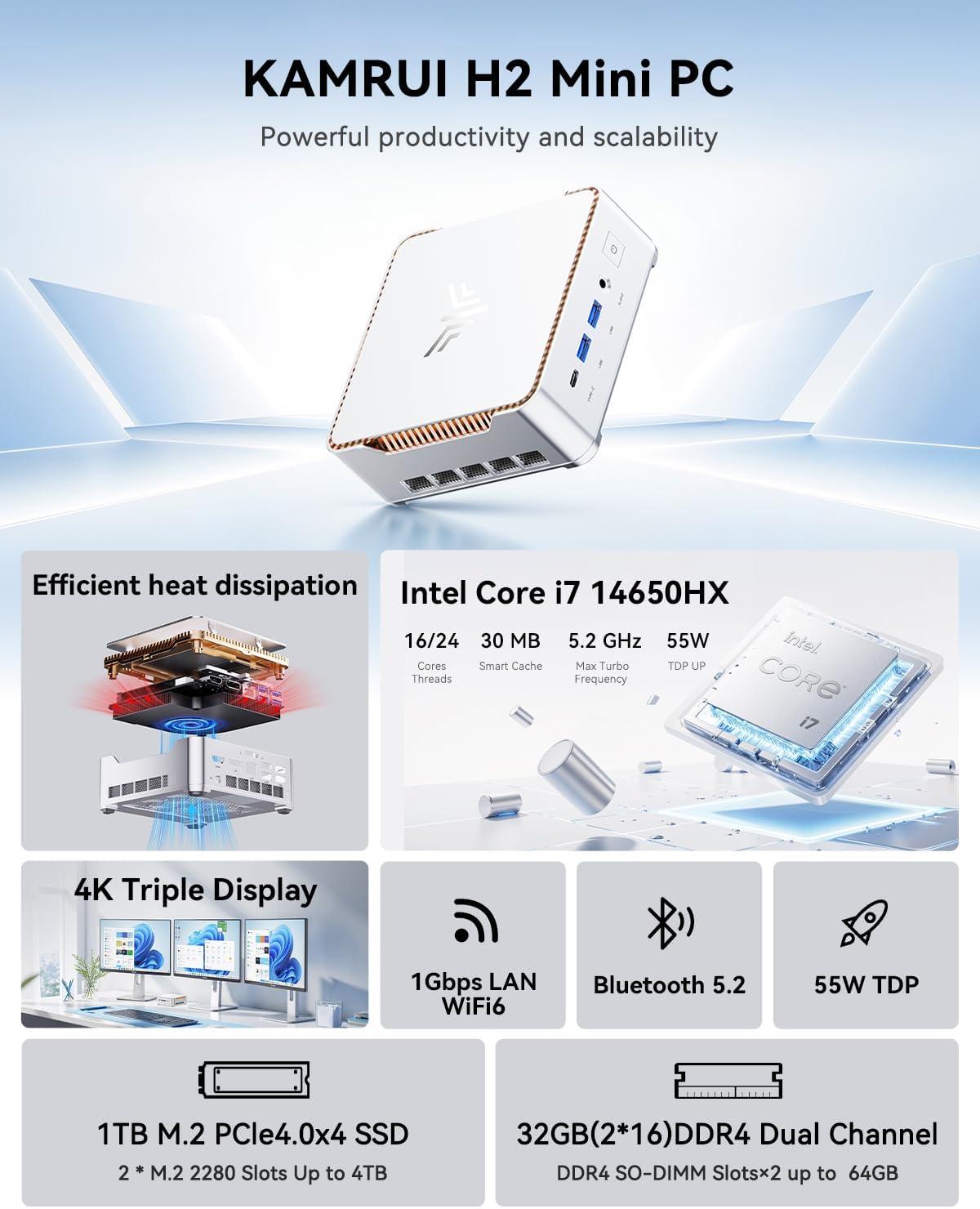 KAMRUI focus on product quality, emphasize its compact design, create an eye-catching design appearance and foreground key features: multiple screen display support, lightness, expanded storage expansion, and powerful CPU processor.