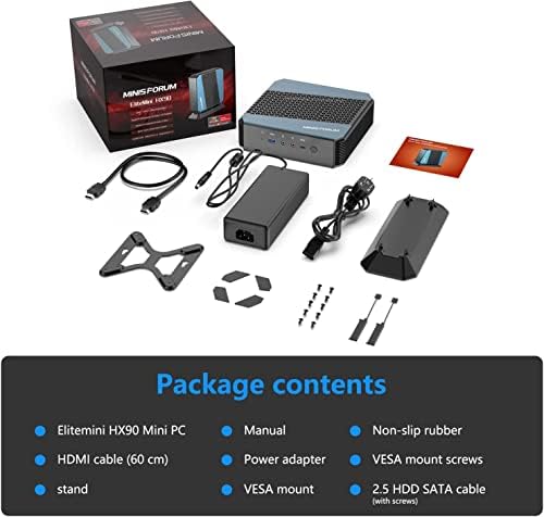 【Package Contents】1x HX90 Mini PC, 1x VESA Mount, 1x HDMI cable (60cm), 1x power adapter, 1x manual, 1x Stand, 1x VESA mounting screw, 2×2.5″ SATA hard drive cable (with screws).