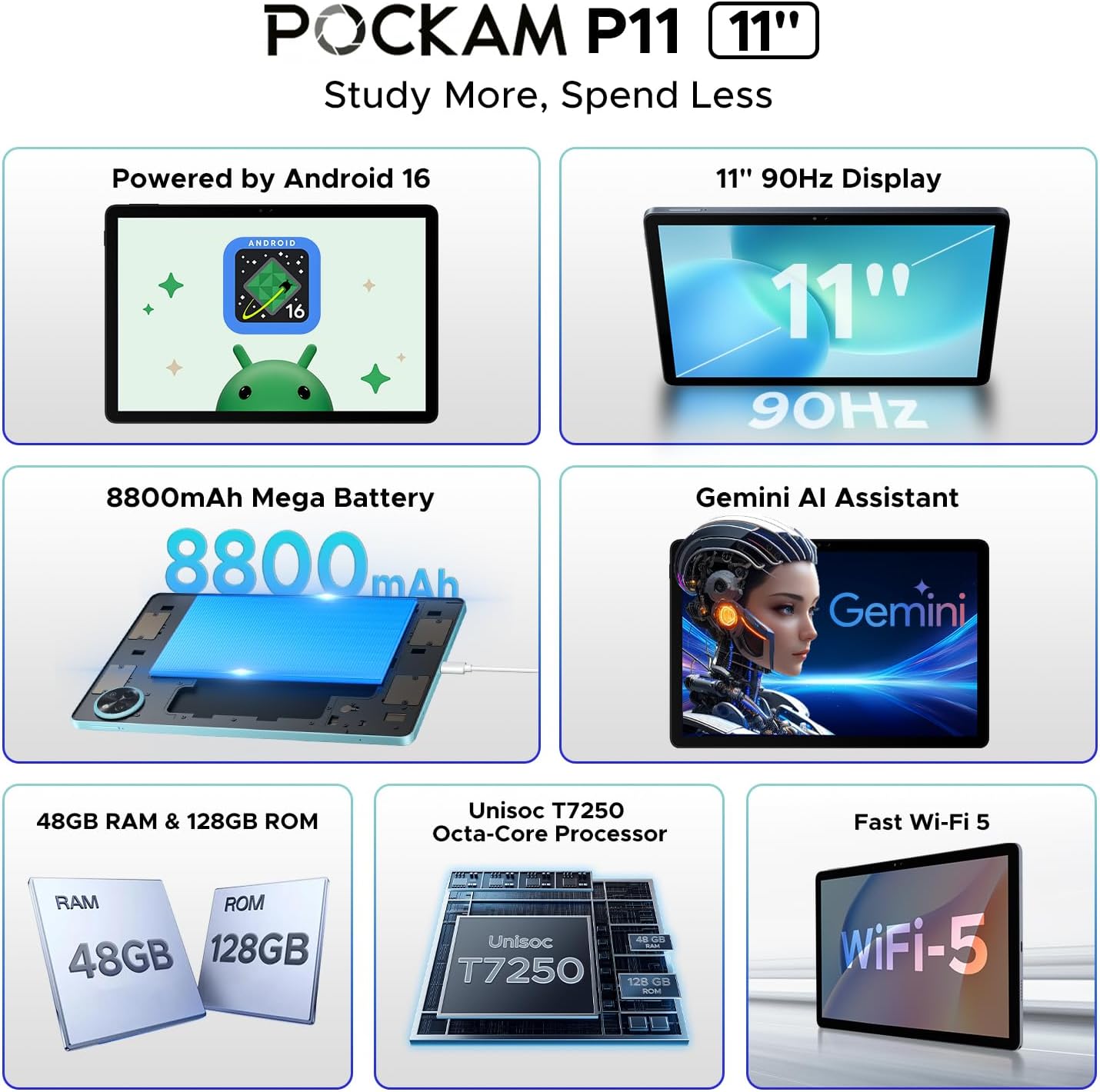 P11 11 Inch Tablet (2026), Android 16 Tablet with Gemini AI, 48GB RAM+128GB ROM/TF 2TB,T7250, 90Hz Display 8800mAh Tablets with Keyboard, Pen, Mouse, 13MP+5MP, 3.5mm Jack, 5G WiFi, Blue