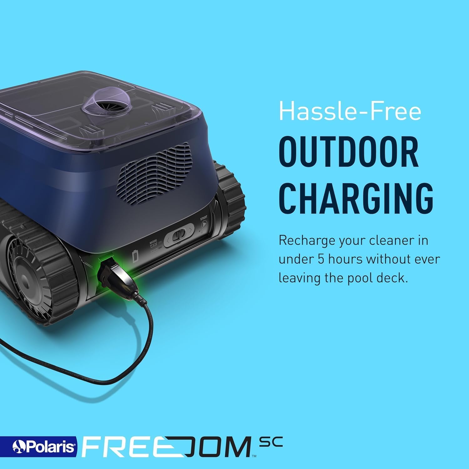 Simple Charging: Recharge your cleaner in under 5 hours without ever leaving the pool deck. FREEDOM SC is rated for outdoor charging — simply attach the power cord to the back of the cleaner and plug it into any outlet nearby.