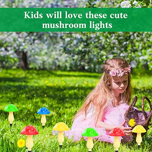 Auto ON/OFF: In the first time to use, press the Power button once to turn on; when it gets dark they light on automatically and are very cute!Long 8 in 1 Wired Light: One big solar panel and a wire connecting the mushrooms to each other, long wires offers lots of option.Adjustable Solar Panel: The solar panel adjusts so you can get the best direction for charging, make sure it’s facing the sun perfectly.Memory Function: Turn the mushroom lights off and turn on again, it will remain the same color where you set at.Bright and Pretty Addition: Such cute mushrooms to accent outside garden or bushes, nice addition to patio container plants, it looks good for outdoor decorations, you can even camp out with them for a fairytale night.