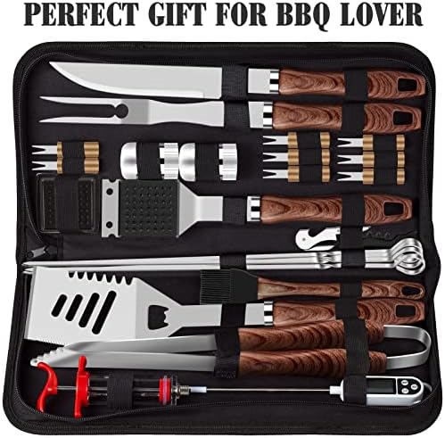 ROMANTICIST 26pcs Grilling Accessories Kit for Men Women, Stainless Steel Heavy Duty BBQ Tools with Glove and Corkscrew, Grill Utensils Set in Portable Canvas Bag for Outdoor,Camping,Backyard,Brown