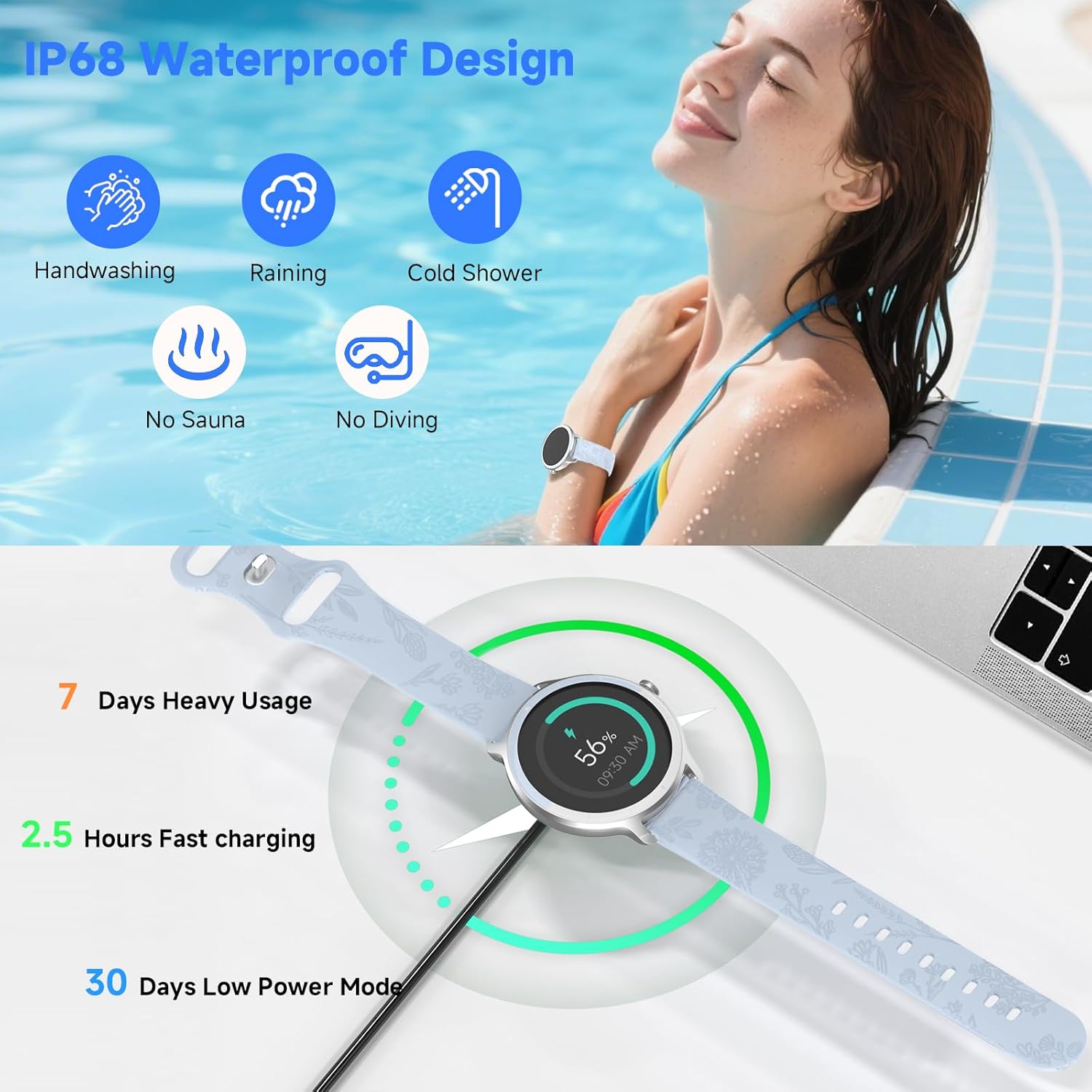 【Over 100 Sports Modes, Your All-Around Fitness Companion】With more than 100 built-in professional sports modes, it covers a wide range of activities from running, cycling, swimming to yoga, workouts, and ball sports, both popular and niche. It accurately records various data during your exercise (such as heart rate, calories burned, and duration), helping you analyze training progress scientifically. It’s an indispensable professional all-around fitness coach by your side. With an IP68 waterproof rating, you can safely wear it while swimming, washing hands, or taking a shower.