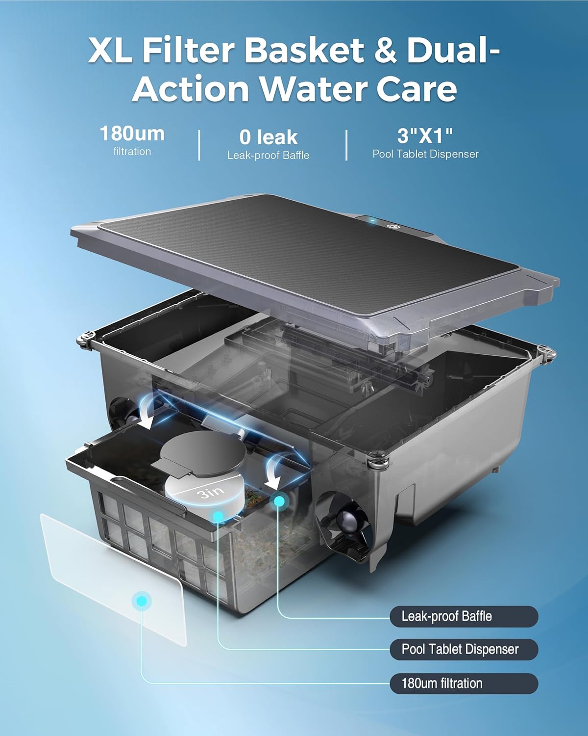 XL Filter Basket & Integrated Chlorine Dispenser: Capture everything from large leaves to fine sand with our high-capacity 180μm micro-mesh filter. The integrated 3-inch chlorine dispenser (chlorine not included) helps maintain consistent water clarity and balance while the pool skimmer robot moves. It is designed to provide a crystal-clear swimming environment for your entire family