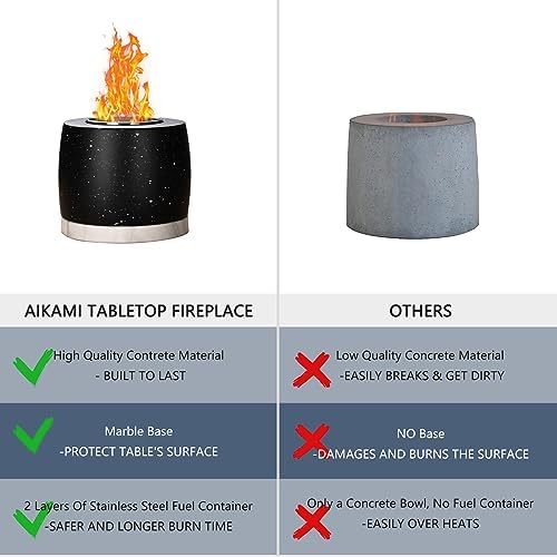 AIKAMI Tabletop Fireplace is from original factory and pick up after strict process quality inspection. It is more protable, safe, durable, smokeless. The small size Fire Pit is lightweight and easy to transport for indoor or outdoor use, and it has long burning time up to 120 minutes. It can be a smores maker and also perfect for camping, picnic, city bonfire and parties.It is the perfect decoration or gift for Birthdays, Christmas Days etc.