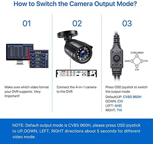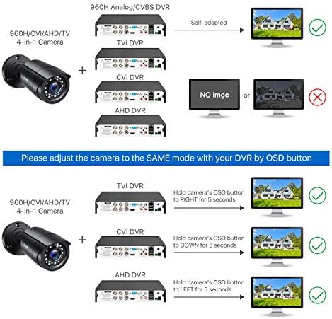 (4). [ Default Video Mode is Analog 960H Mode ] __ Compatible with HD-CVI/TVI/AHD/Analog DVRs. However,if you want to switch to 1080p video mode, please make sure your DVR support 1080p resolution ,or it won’t show 1080p images.