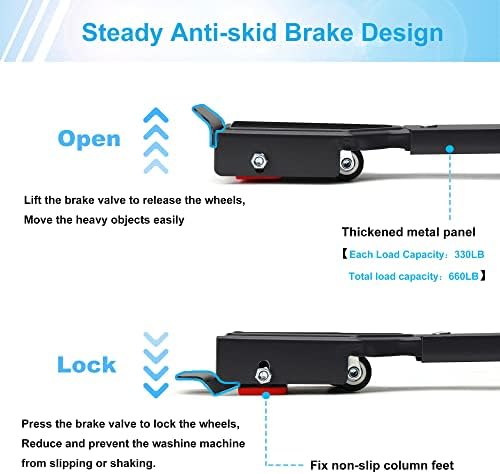►【Excellent Quality & Stability】: Widened design at both ends of the moving roller, which meets your daily use and provides firm support. Both ends of each mobile base are equipped with black anti-slip pads and column-type brakes to increase friction, stabilize and prevent slipping, reduce machine vibration and won’t damage the floor. Improve the stability and safety of home appliances and furniture equipment.
